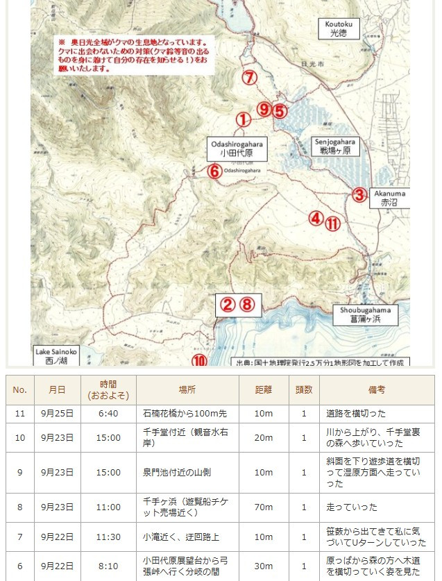 一般的に熊は人の気配を避けるため、積極的に観光客を襲ってくる可能性は低いと考えられますが、高尾山などの山に登る場合は、クマ鈴やスプレーの携帯など、一定の対策が必要だといいます。日光ではメジャーなハイキングコースである「戦場ヶ原」でも、最近だけでも以下のような目撃情報があります。お出かけの際には、目撃情報を必ずチェックするようにしましょう。